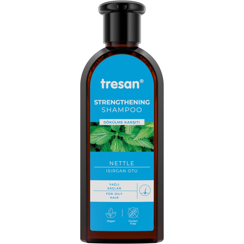 Tresan Kräftigungsshampoo mit Brennnessel 300ml ist ein Spezialshampoo für fettiges und geschwächtes Haar, das zu Haarausfall neigt. Dank des Brennnesselextrakts und der die Haarfollikel stärkenden Inhaltsstoffe hilft das Shampoo, den Haarausfall zu reduzieren, das Haarwachstum zu stimulieren und die Widerstandsfähigkeit der Haarfasern zu verbessern. Es reinigt die Kopfhaut und das Haar wirksam und macht es kräftiger, gesünder und vitaler.