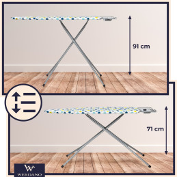 Dank der stufenlosen Höhenverstellung von 71 bis 91 cm passt sich das Brett perfekt an Ihre Körpergröße an. So können Sie sowohl im Sitzen als auch im Stehen bequem bügeln, ohne Ihren Rücken zu sehr zu belasten.